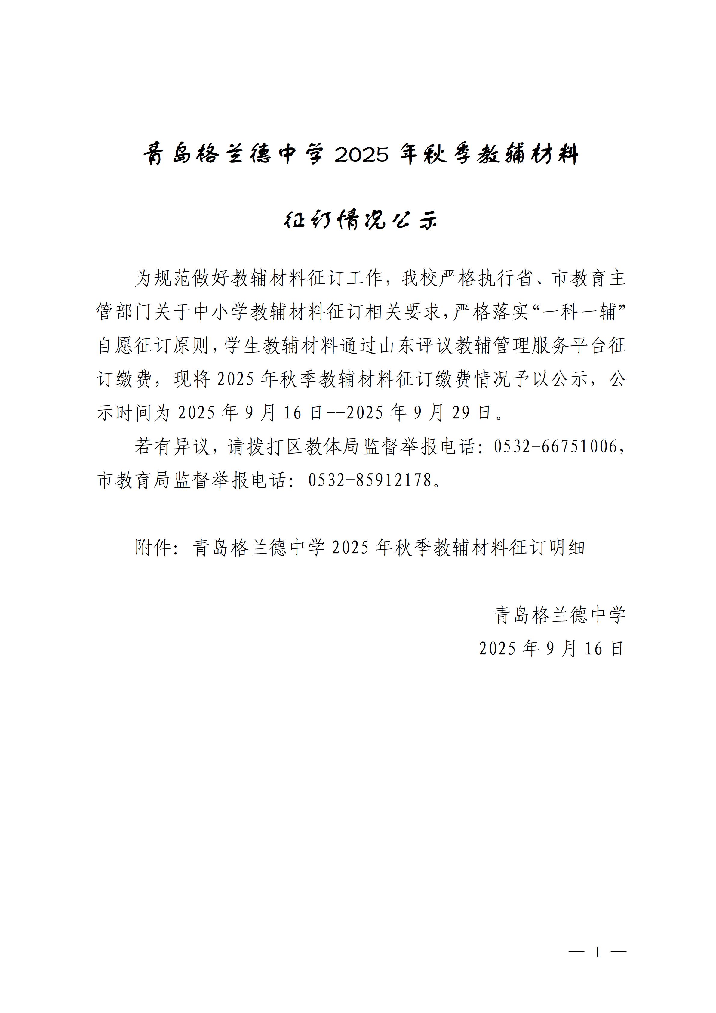 青岛格兰德中学2025年秋季教辅材料征订情况公示