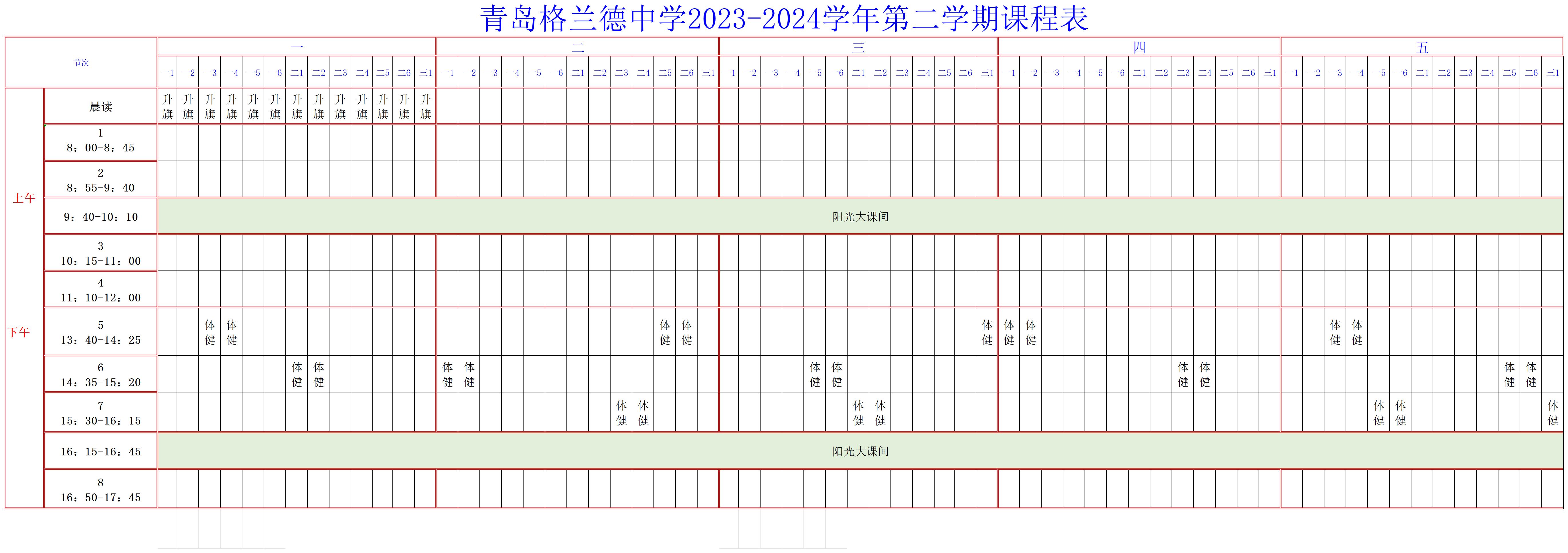 青岛格兰德中学高中部2023-2024学年第二学期体育课程表公示