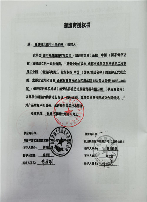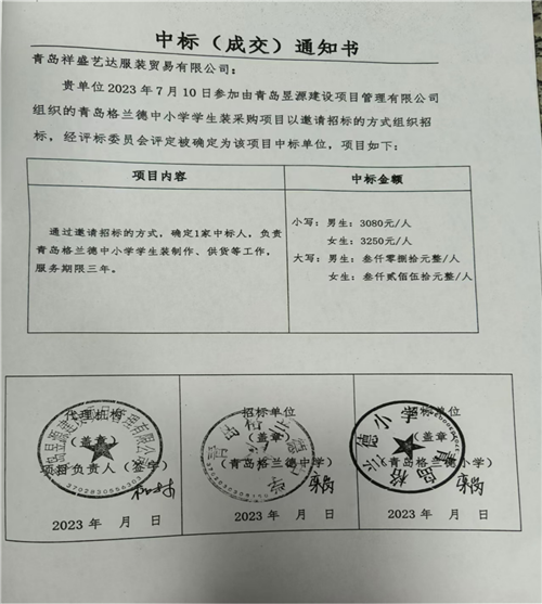 根据2023年《青岛格兰德中小学学生装采购项目》招标,项目编号:QDYYPD20230703,2024-2025学年青岛格兰德中小学校服采购,由青岛祥盛艺达服装贸易有限公司负责,现对采购厂家进行公示。