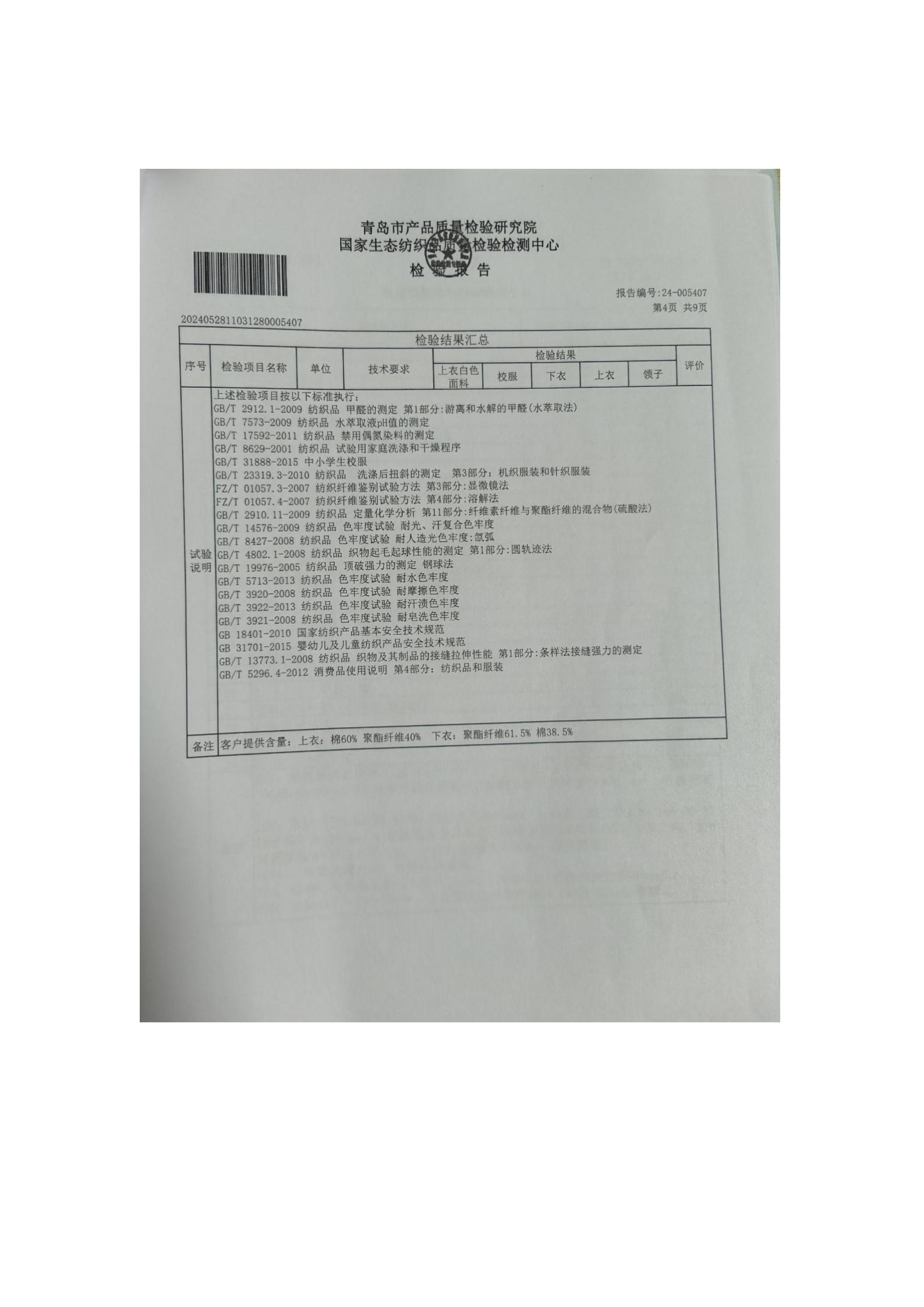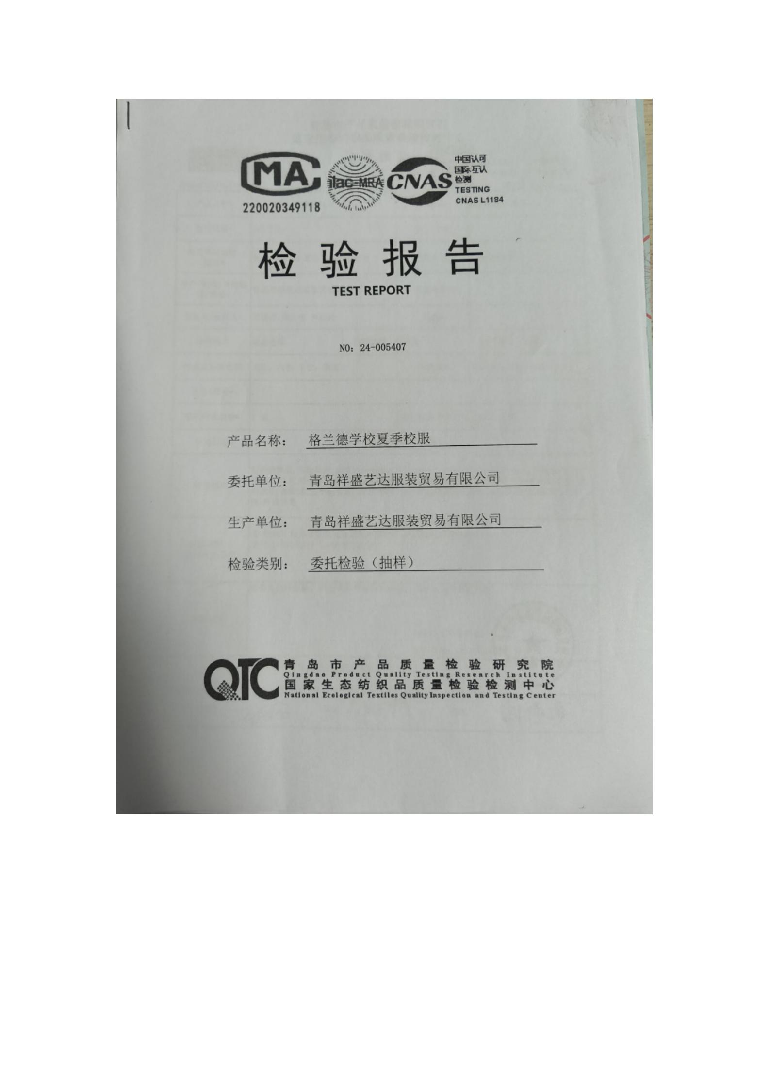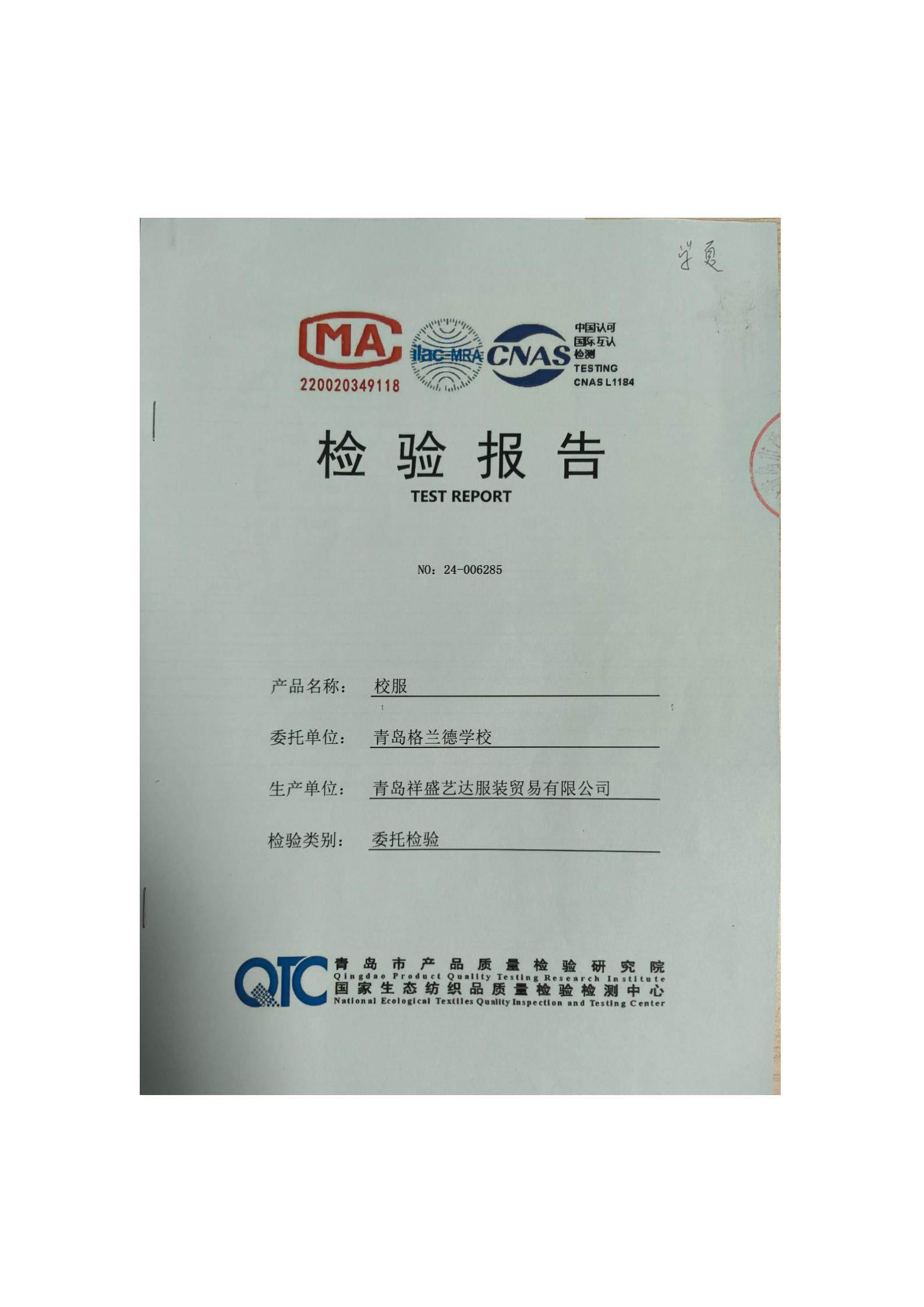 按照青岛市教育局的规定和要求,青岛祥盛艺达服装贸易有限公司抽样送检,青岛格兰德中小学校服领导小组和校服家长委员会派出代表,2024级学生夏季校服抽样送检,学校企业双质检报告合格,特此公示。