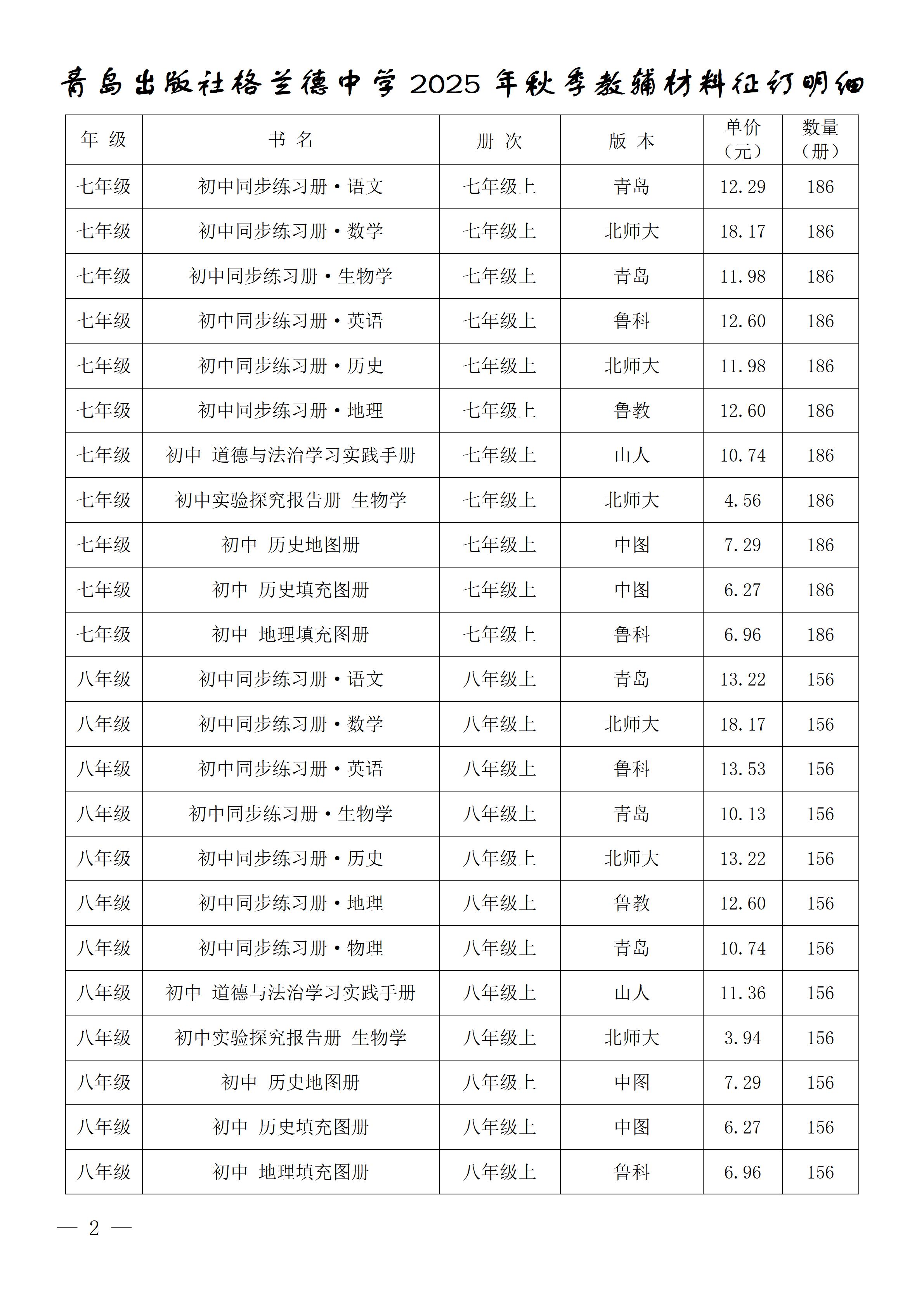 青岛格兰德中学2025年秋季教辅材料征订情况公示
